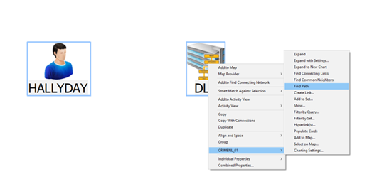 Stel, u wilt weten of er een connectie bestaat tussen de organisatie DLD en de persoon HALLYDAY in uw database. Eerst zoekt u met behulp van ‘Find’ deze twee entiteiten in i2 iBase en visualiseert ze in een i2 Analyst’s Notebook schema.