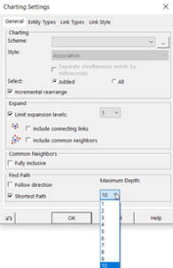 Het ‘Charting Settings’ scherm wordt geopend en onder het kopje ‘Find path’ stelt u de maximale zoekdiepte in (10) zodat alle verbindingen met maximaal 10 entiteiten ertussen gevonden worden. Ook dient de optie ‘Shortest path’ aangevinkt te worden. Op deze manier worden de sterkste verbindingen (dus met de minste tussenkomst van entiteiten) weergegeven. Druk op ‘OK’.