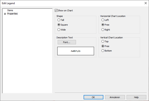 Aan de linkerzijde van het venster staat de optie “Properties”. Hiermee geeft u aan waar de legenda dient te staan. Mocht u na het aanmaken van de legenda moeite hebben om dit terug te vinden in het schema, druk dan nogmaals op de legendaknop en kies bijvoorbeeld voor “Left” en “Top”. Zo weet u dat de legenda linksboven zal staan. Kiest u voor “Free”, dan kunt u de legenda vrij in het schema plaatsen door het te verslepen.