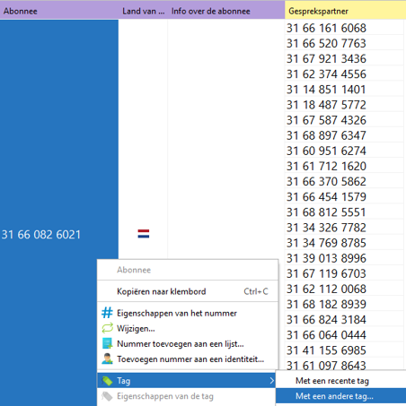 Selecteer het telefoonnummer, IMEI, IMSI, gebruikersnaam, enzovoort van een persoon. Klik op de rechtermuisknop en navigeer naar ‘tag’’ --> ‘Met een andere tag…’.