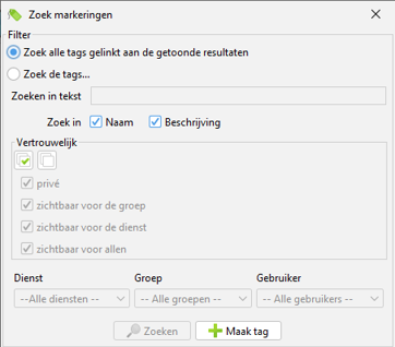 U kunt zoeken in bepaalde diensten, groepen of op basis van gebruiker. Daarnaast is het mogelijk te zoeken op de naam van de tag en kunt u meerdere tags selecteren wanneer u bijvoorbeeld in een zaak of vordering de communicatie van meerdere personen wilt opzoeken.