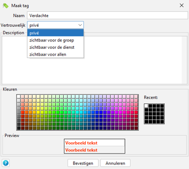 Hierna kan er een titel gegeven worden aan de tag, een beschrijving, kan de kleur worden gekozen en kan er bepaald voor wie de tag zichtbaar is.