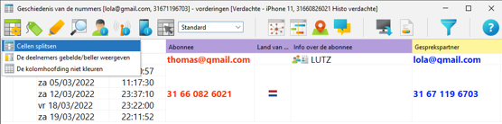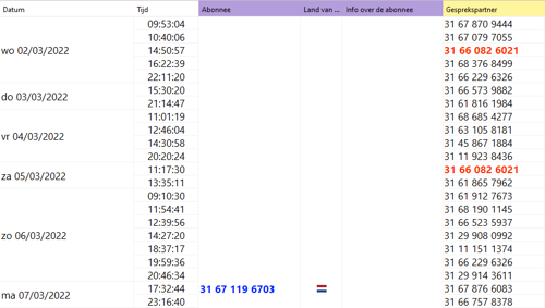 Om de communicatie tussen twee of meerdere partijen op te zoeken, is het noodzakelijk om de gegevens van de tegenpartij met een andere tagkleur te markeren. In dit voorbeeld gaan we opzoek naar de communicatie tussen de verdachte en het slachtoffer binnen de histo’s en de extracties. De gegevens van de verdachte hebben een rode kleur gekregen en die van het slachtoffer een blauwe kleur. In de histo van beide personen komen de kleuren direct terug waardoor er in één oogopslag te zien is dat er communicatie heeft plaatsgevonden tussen beide partijen.