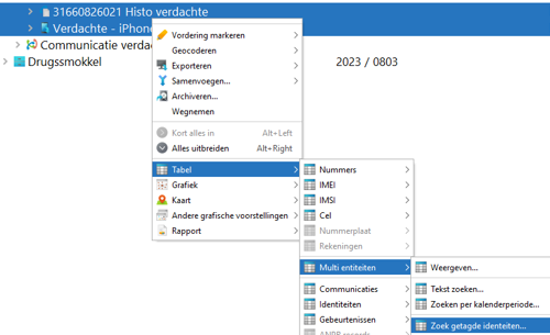 Selecteer de items van de verdachte en klik op de rechtermuisknop zodat het drop down menu zichtbaar wordt. Navigeer vervolgens naar ‘Tabel’--> 'Multi Entiteit’ --> ‘Zoek getagde identiteiten…’.