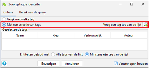 In het volgende venster heeft u de mogelijk om opzoek te gaan naar de tag van het slachtoffer. Door de optie ‘Met een selectie van tags’ aan te vinken, kunt u met het vergrootglas de juiste tag selecteren.