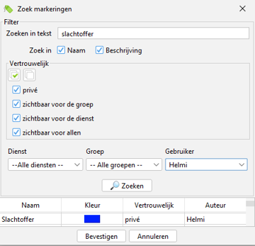 Door de juiste tag(s) te selecteren wordt er in de verschillende vorderingen gezocht naar de communicatie tussen de verdachte en het slachtoffer. Het resultatenvenster geeft weer of en wanneer er communicatie tussen beide partijen heeft plaatsgevonden.