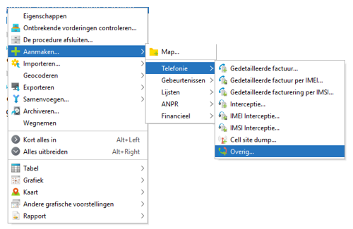 Om de communicatie tussen beide (of meerdere) personen in één overzicht weer te geven, moeten er een aantal aanvullende stappen worden uitgevoerd. Allereerst is het noodzakelijk dat er een lege lijst toegevoegd wordt aan de werkruimte waarin de communicatie gekopieerd kan worden. Hiervoor kan onder de optie ‘Tabel’ --> 'Telefonie’ een ‘Overig…’ communicatielijst aangemaakt worden.