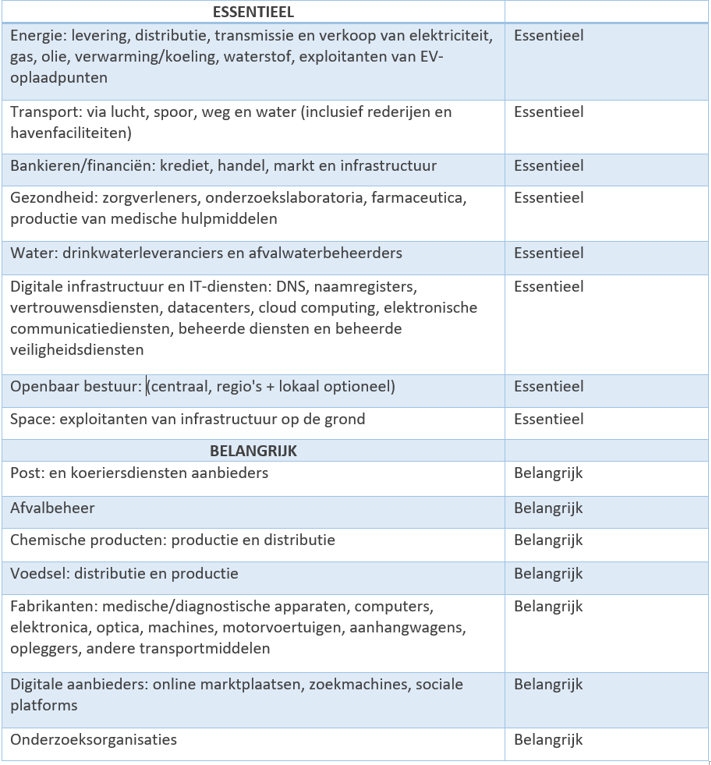 NIS2 - Essentiële en belangrijke entiteiten per sector